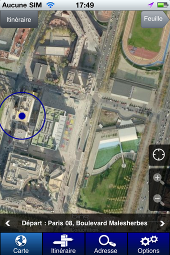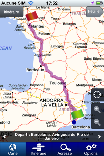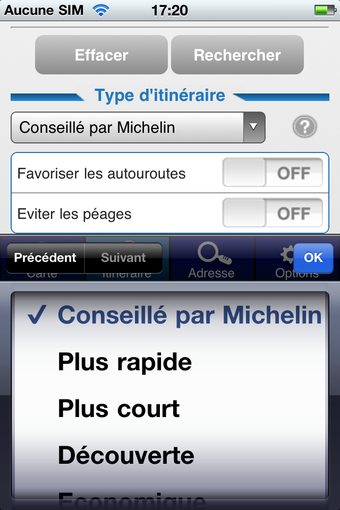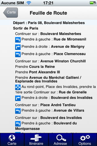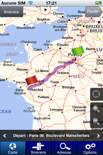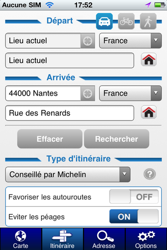 - le premier "Carte" permet d'explorer la mappemonde en toute liberté- dans "Itinéraire", vous pouvez définir le trajet de votre choix en renseignant le point de départ et d'arrivée ainsi que d'autres paramètres plus fins (le type d'itinéraire, avec ou sans autoroutes, en évitant les péages, etc)- l'onglet "Adresse" permet de localiser avec précision un point sur la carte- dans le menu des "Options", vous pouvez sélectionner le type de cartes et les informations complémentaires que vous souhaitez visualiser (stations services, radars, parkings, prévisions météo, restaurants, etc)