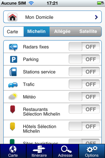 Pour gagner du temps, vous pouvez enregistrer l'adresse de votre domicile fixe. Couplé au système de géolocalisation, ViaMichelin Mobile est capable de tracer votre itinéraire de retour en quelques instants.